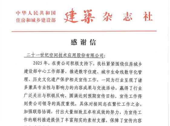近日,住房和城乡建设部向世纪空间发来感谢信,对世纪空间在推进数字住建、城市生命线数字化管理、历...