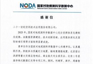 近日,国家对地观测科学数据中心向世纪空间发来感谢信,对世纪空间长期以来在国内外重大灾害应急响应、商业航天专业委员会建设、卫星存档元数据汇交等专项工作中所付出的努力与贡献表示感谢。 作为国家对地观测科学数据中心共建单位和首批商业数据资源分中心...